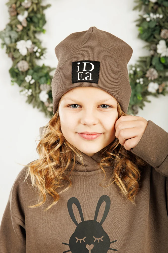 Modeliai yra 134-140cm ūgio. Dėvimos kepurės spalva: Pieniško šokolado, Tamsiai pilka, Smėlio, Šviesiai rožinė.
